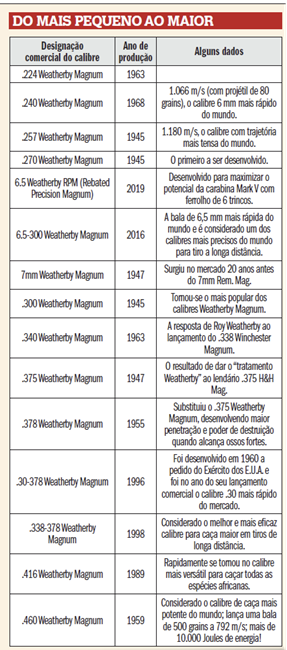 A história começou em meados do século passado com o norte-americano Roy Weatherby que desenvolveu um conjunto de calibres ainda hoje estão no topo da lista dos mais velozes do mercado.