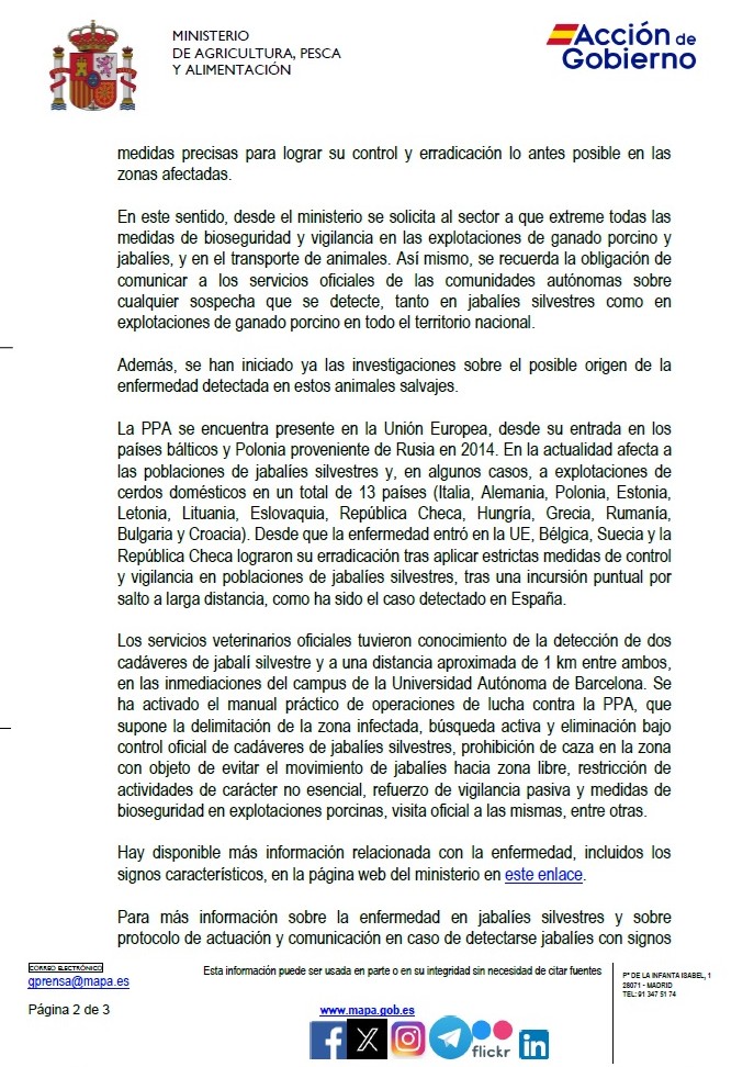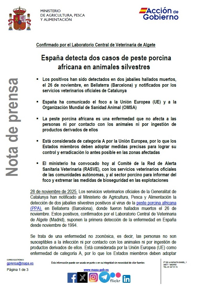 No passado dia 28 de novembro o Ministério da Agricultura, Pesca e Alimentação do Governo de Espanha emitiu um comunicado confirmando – pelo Laboratório Central de Veterinária de Algete – dois casos de Peste Suína Africana na localidade de Bellaterra, Barcelona.