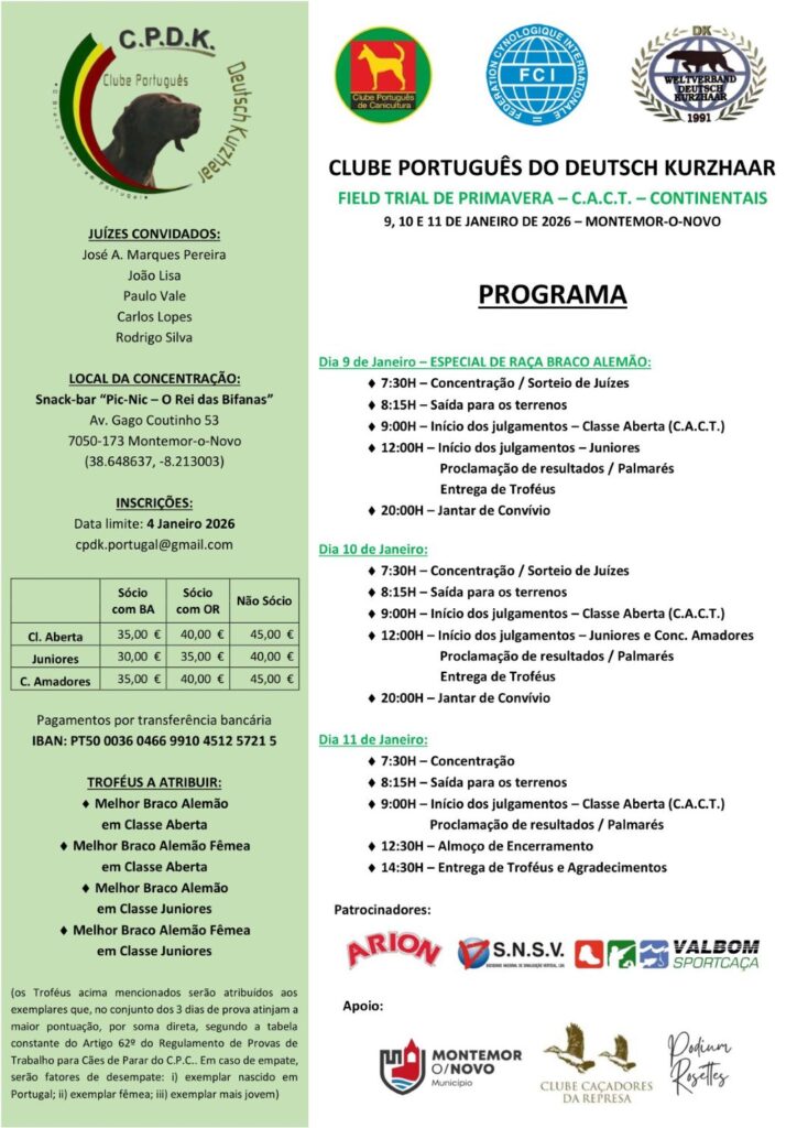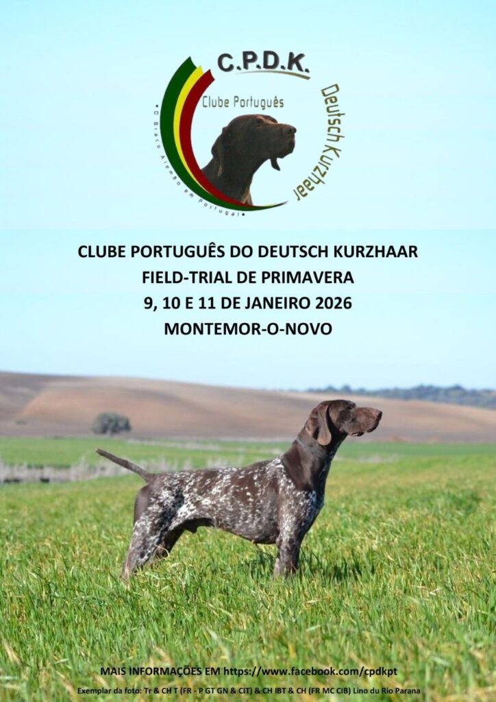 Notícias 9 a 11 jan | FIELD TRIAL DE PRIMAVERA CPDK by Redação 7 de Janeiro, 2026 written by Redação 7 de Janeiro, 2026 22 Nos dias 9, 10 e 11 de Janeiro 2026, realiza-se o Field Trail de Primavera, em Montemor-o-Novo, com a organização do CPDK (Clube Português do Braco Alemão) e o Clube de Caçadores da Represa. Para se inscrever, pode fazê-lo AQUI. BRACO ALEMÃOcpcFIELD TRAILprovas de primavera 0 comment 0 FacebookTwitterPinterestEmail Redação previous post A caça na Alemanha está a crescer You may also like Exames para carta de caçador 18 de Dezembro, 2025 Peste Suína Africana em Espanha 2 de Dezembro, 2025 1 a 7 dez | Semana da Caça... 25 de Novembro, 2025 22 nov | Demonstração de miras 21 de Novembro, 2025 14 a 23 nov | 7ª Quinzena Gastronómica... 20 de Novembro, 2025 15 e 16 nov | XVI Feira da... 11 de Novembro, 2025 Dia de Santo Huberto 4 de Novembro, 2025 Fêmea de veado entra no quartel da GNR 15 de Outubro, 2025 24 a 26 out | Feira de Caça... 1 de Outubro, 2025 15 nov | II Prova de Santo Huberto... 23 de Setembro, 2025 Leave a Comment Cancel Reply Save my name, email, and website in this browser for the next time I comment. Δ