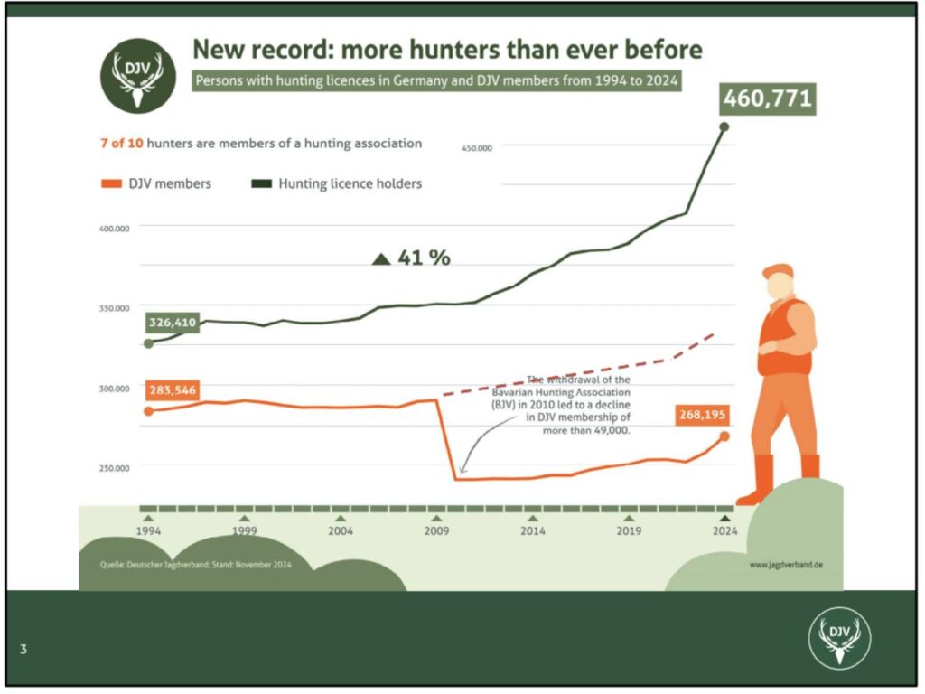 Novos dados da Alemanha mostram uma tendência clara e importante: existem atualmente mais de 460.700 caçadores licenciados no país — quase mais 50% do que há 30 anos.