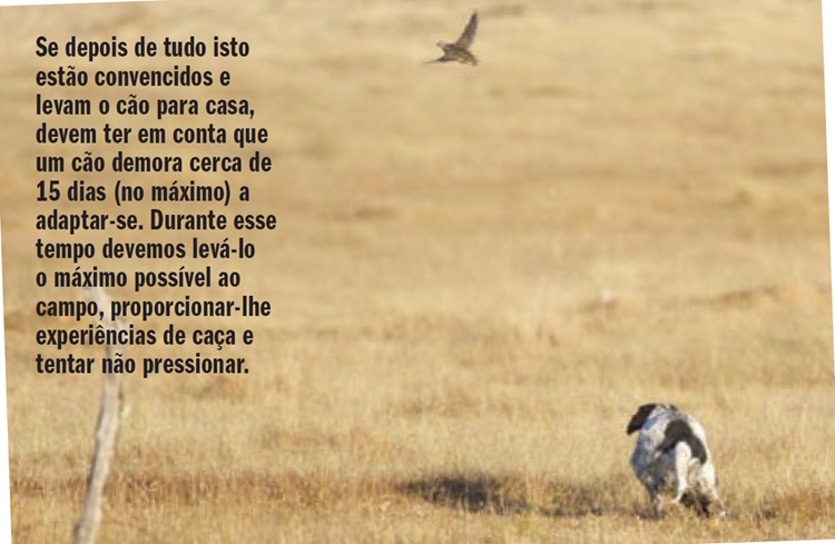 Quando adquirimos um exemplar já iniciado, a primeira coisa (e mais fundamental) a ver é “in situ”, ou seja, fisicamente, no canil, no seu meio, e no campo que conhece. É ridículo confiarem num vídeo, e muito mais é quando confiam somente em fotografias. Se não podem ir até ao sítio onde está o cão é melhor não adquirirem um cão iniciado, porque as suas qualidades têm de se ver fisicamente, pessoalmente. É muito difícil adivinhar se irá adaptar‑se bem, mas ao menos vamos ver como é que reage diante a presença de um estranho. Esqueçam os cães ariscos ou pouco sociáveis. E não se esqueçam disto que vos digo. Se depois de tudo isto estão convencidos e levam o cão para casa, devem ter em conta que um cão demora cerca de 15 dias (no máximo) a adaptar‑se. Se passado este tempo o seu comportamento é arisco, receoso e não se apresenta no terreno tal como o tinham visto quando o foram buscar, o melhor é devolverem‑no e não perderem mais tempo. Obviamente que durante este tempo devemos levá‑lo o máximo possível ao campo, proporcionar‑lhe experiências de caça e tentar não pressionar. E se fizermos isto tudo e o cão não responder como esperamos, o melhor é voltar para onde veio.
